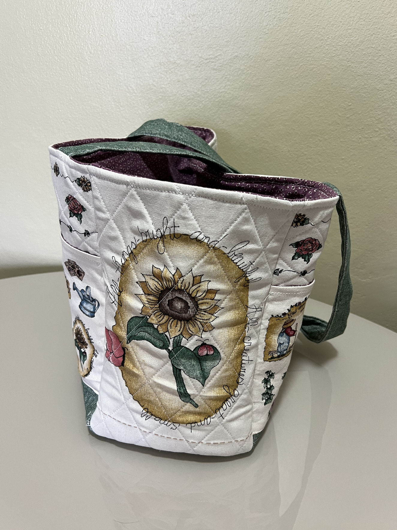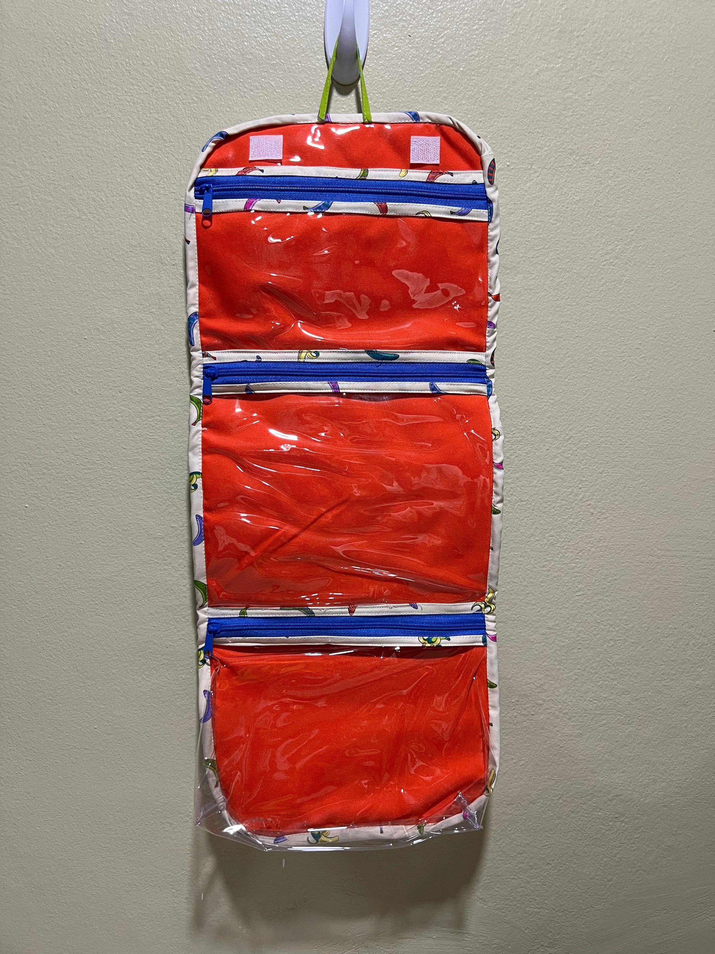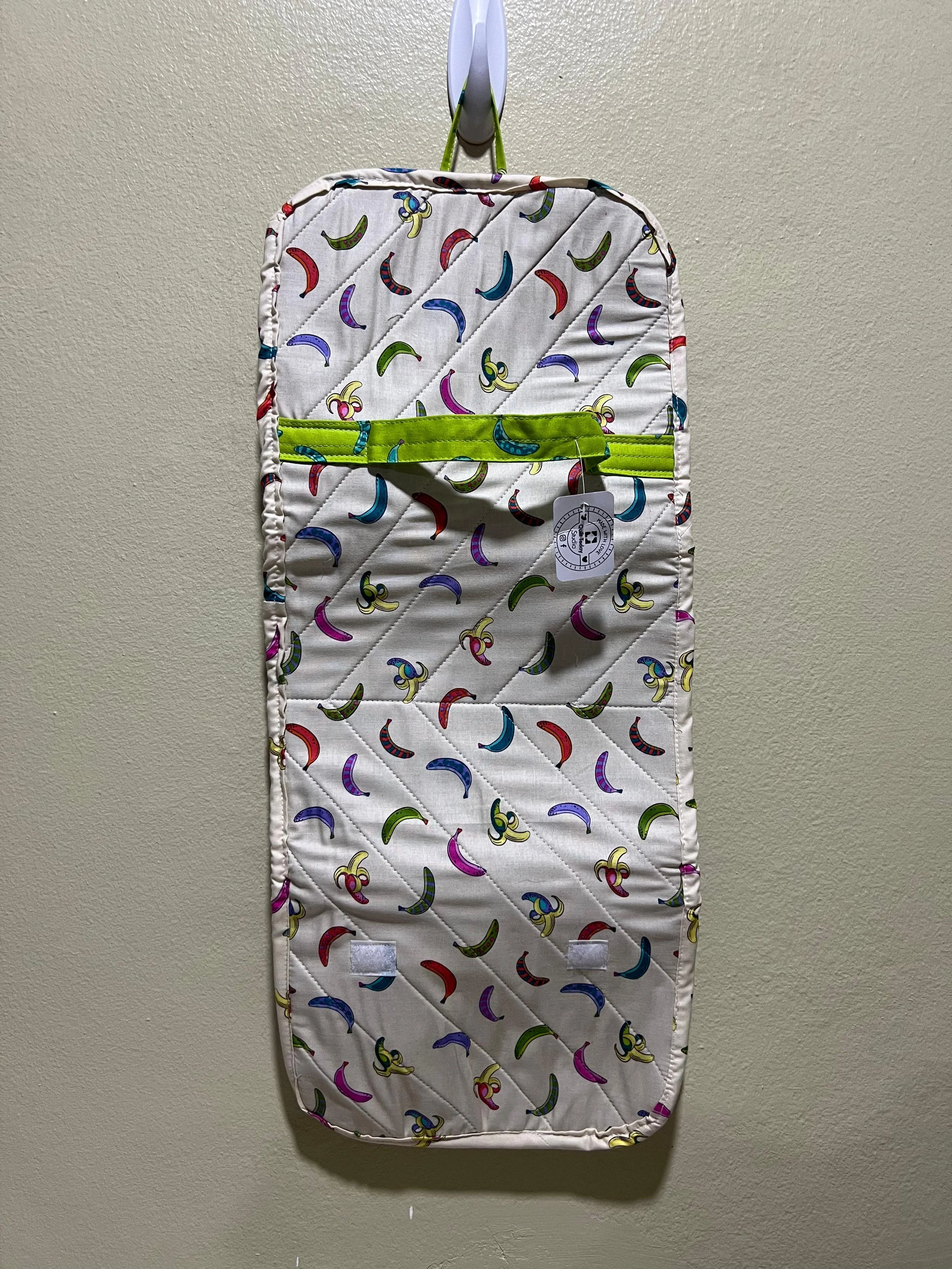 Bolsa de tela verde con flores blancas, contiene un flotador redondo naranja, loción azul, botellita de spray y gafas de sol.