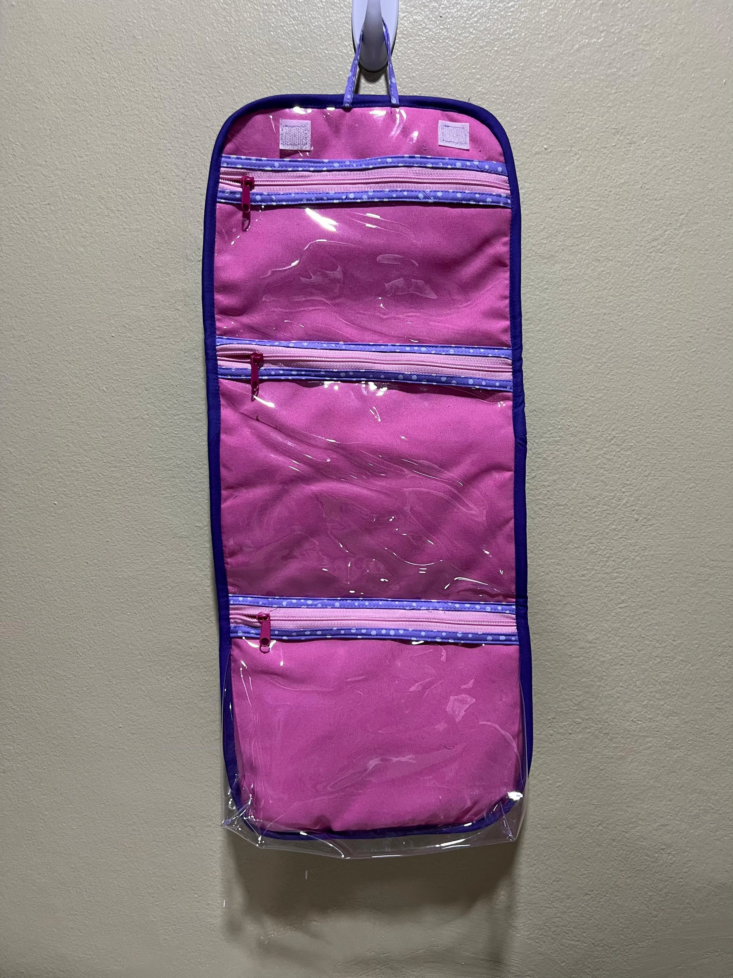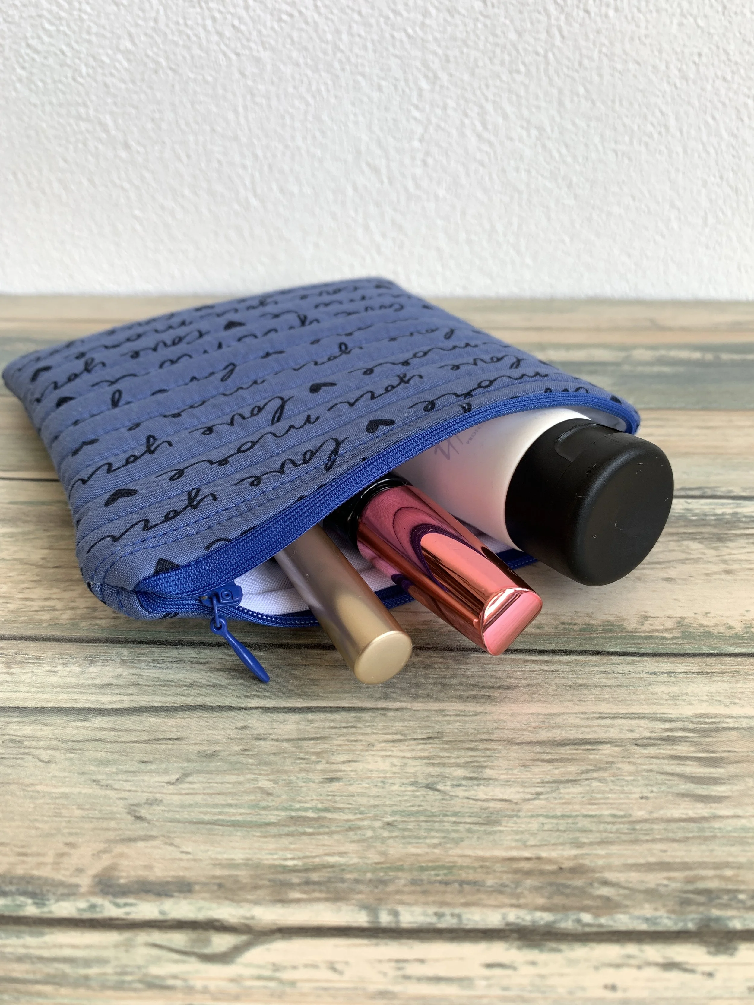 Neceser azul con cremallera abierto mostrando productos de belleza como un tubo de crema, un lápiz labial y un delineador sobre una superficie de madera clara.