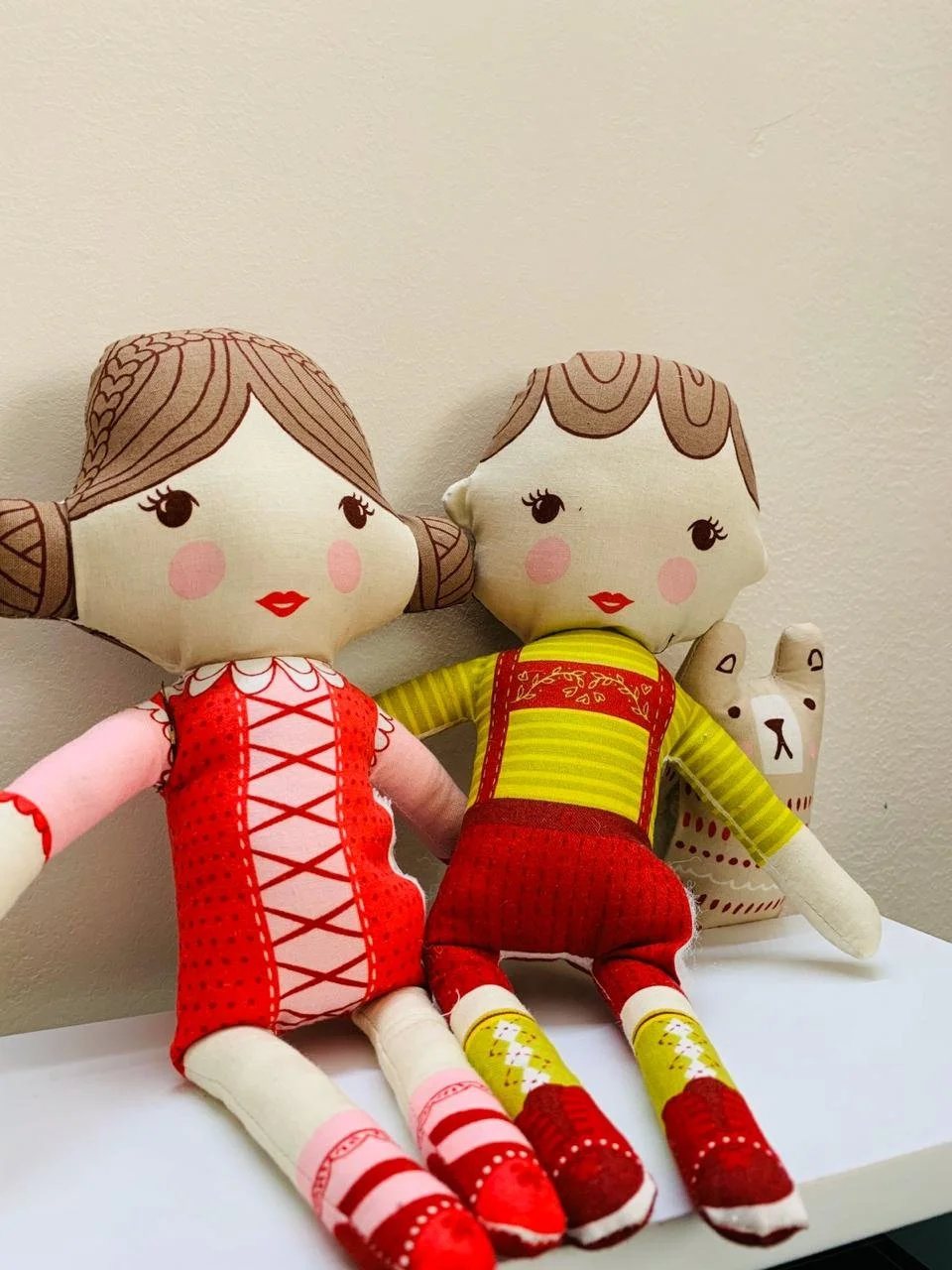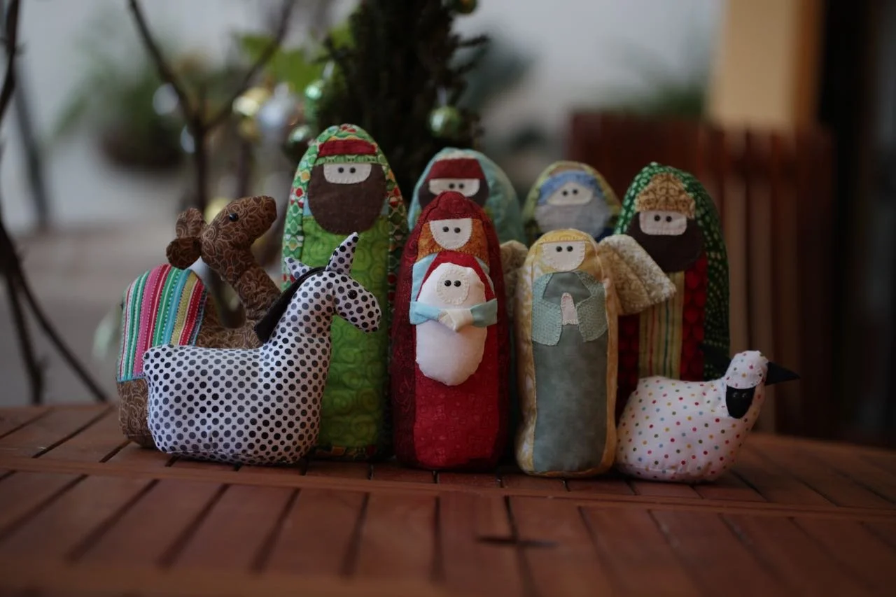 Figuras de tela de un belén, incluyendo personajes religiosos y animales, sobre una mesa de madera.