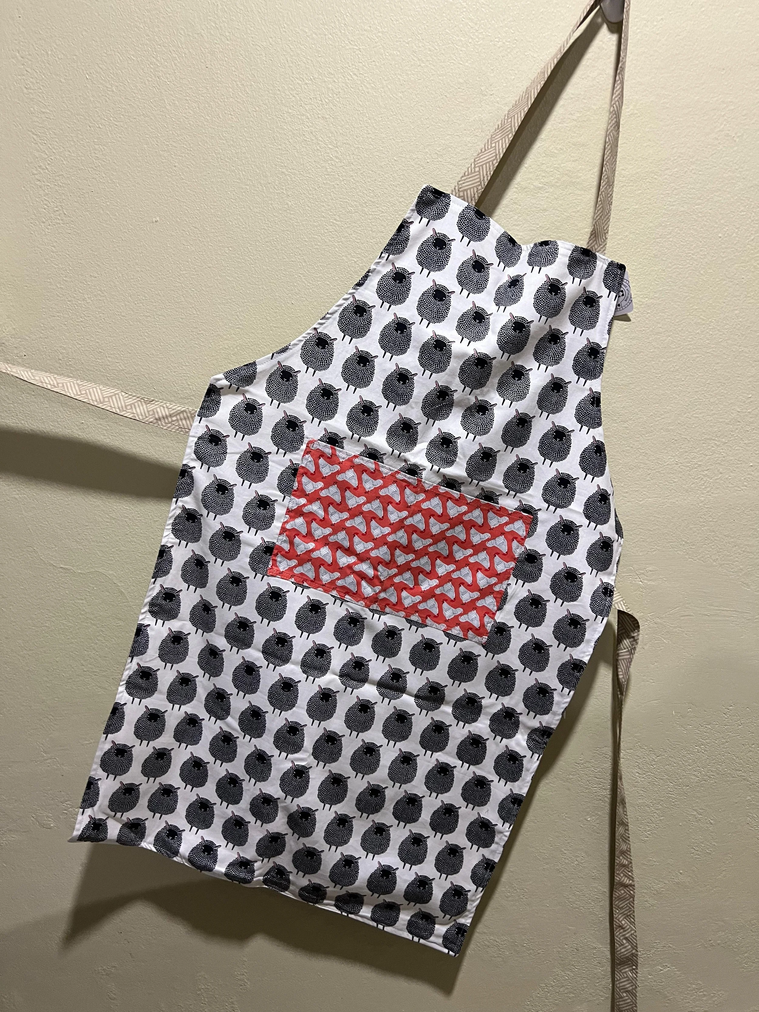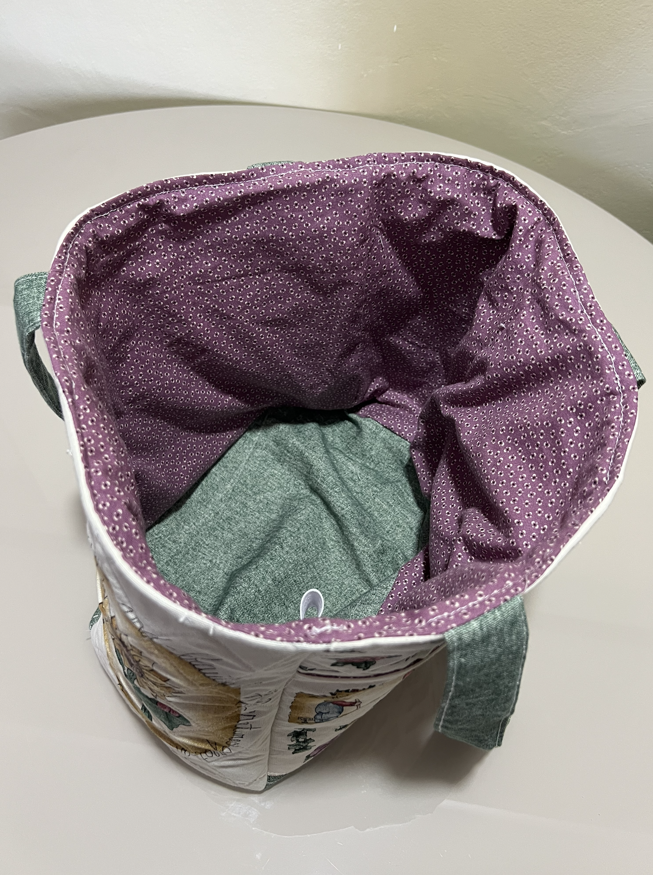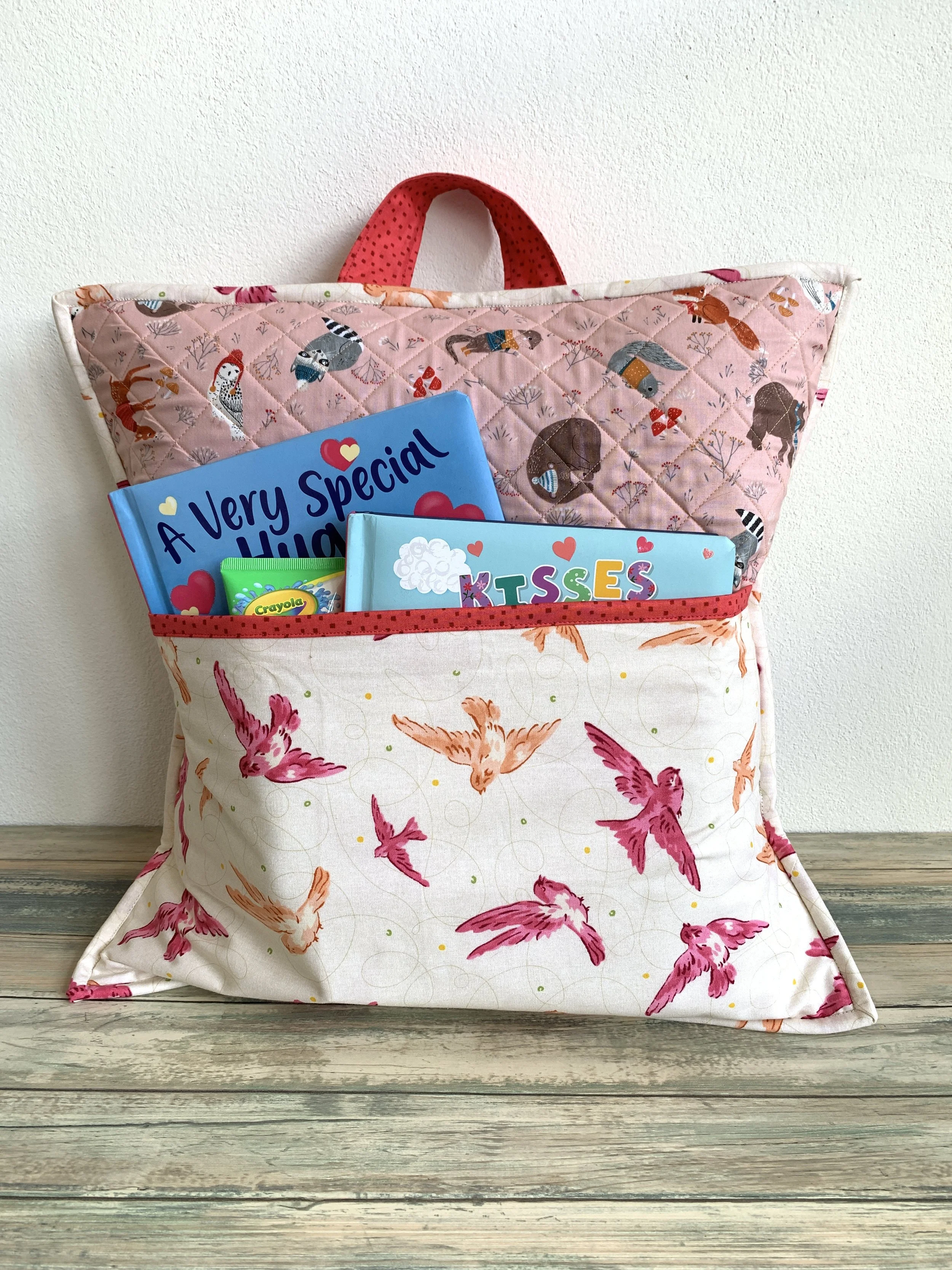 Cojín infantil con diseño de animales y pájaros, con libros en el bolsillo delantero.