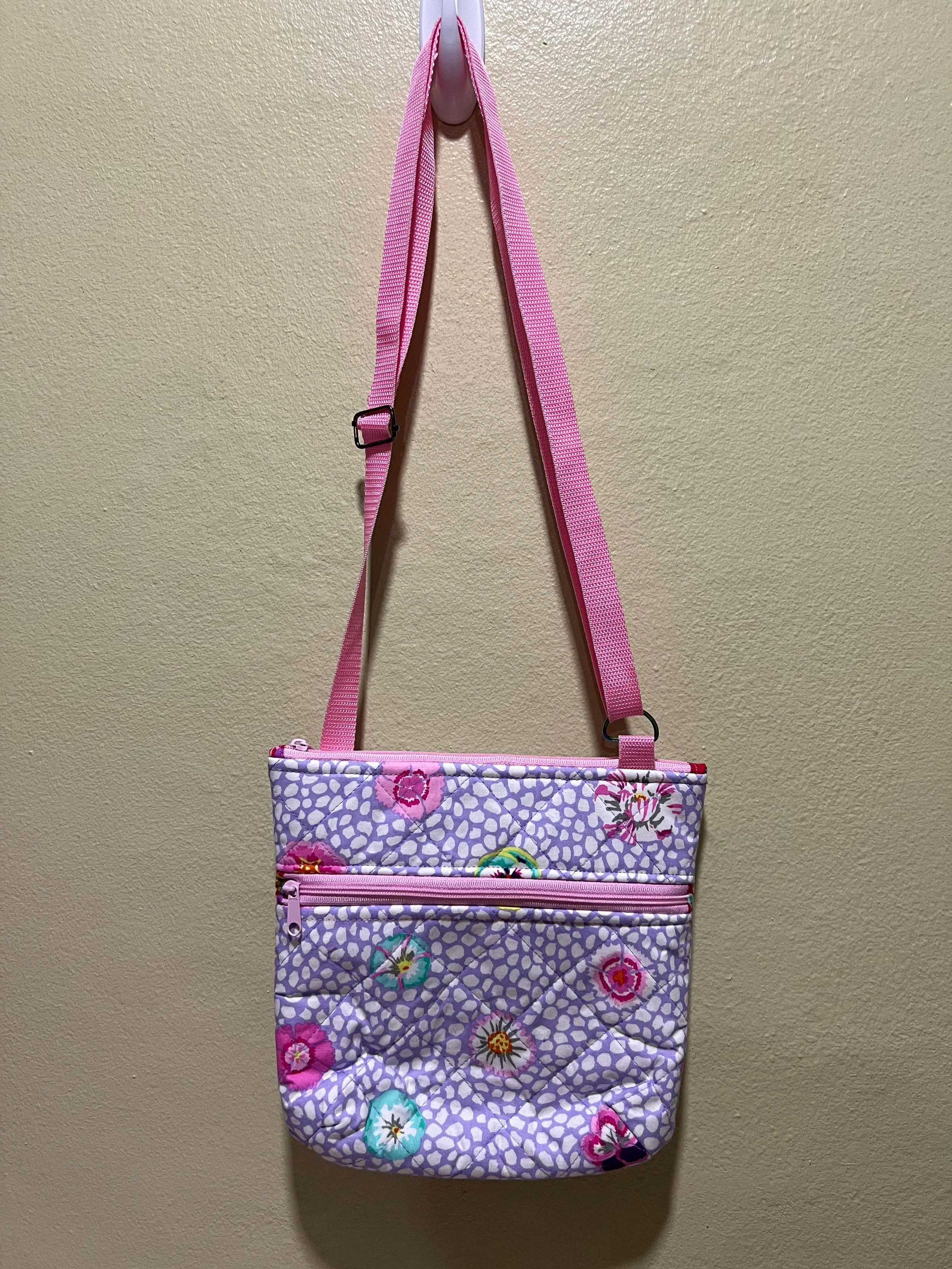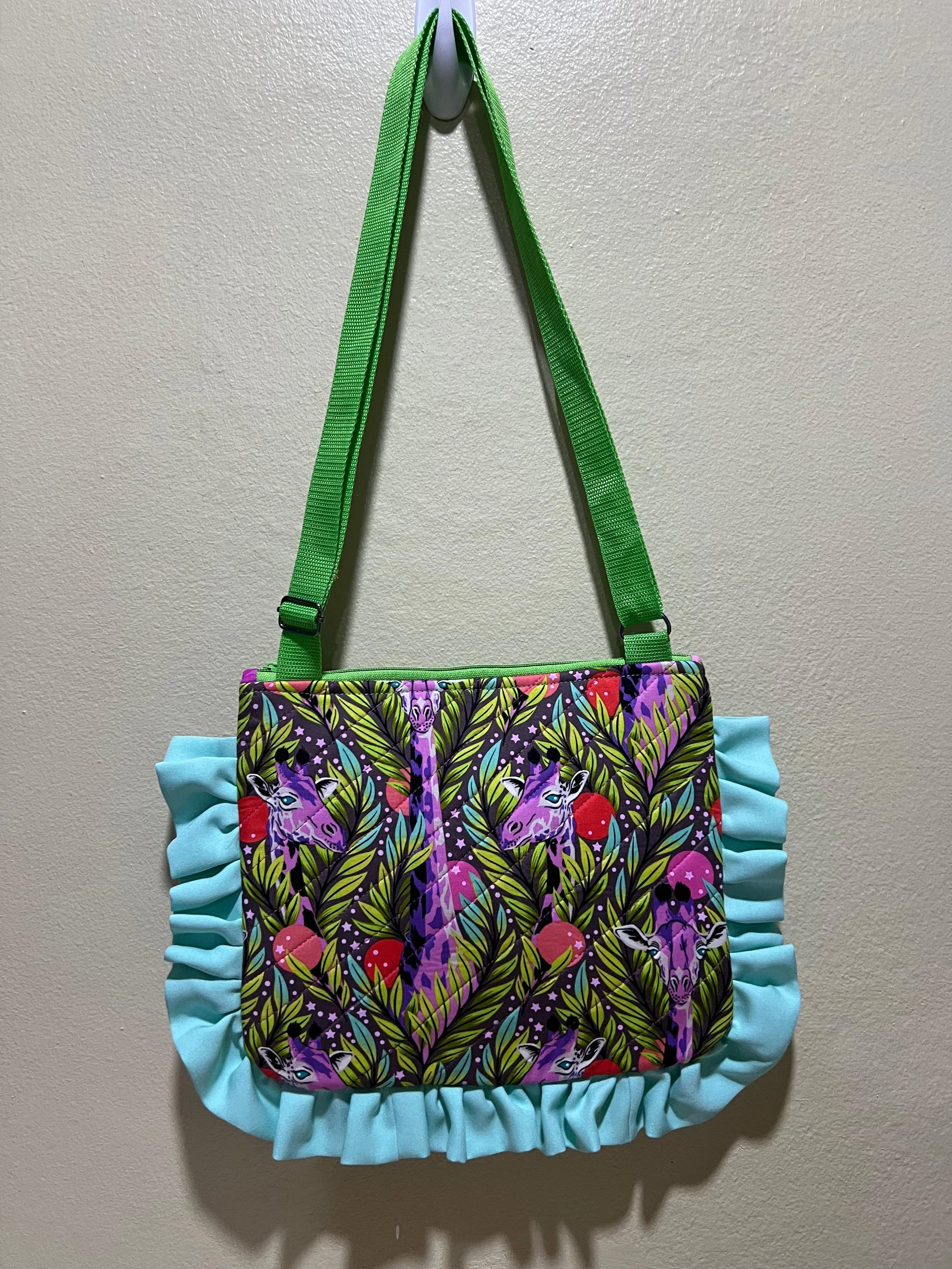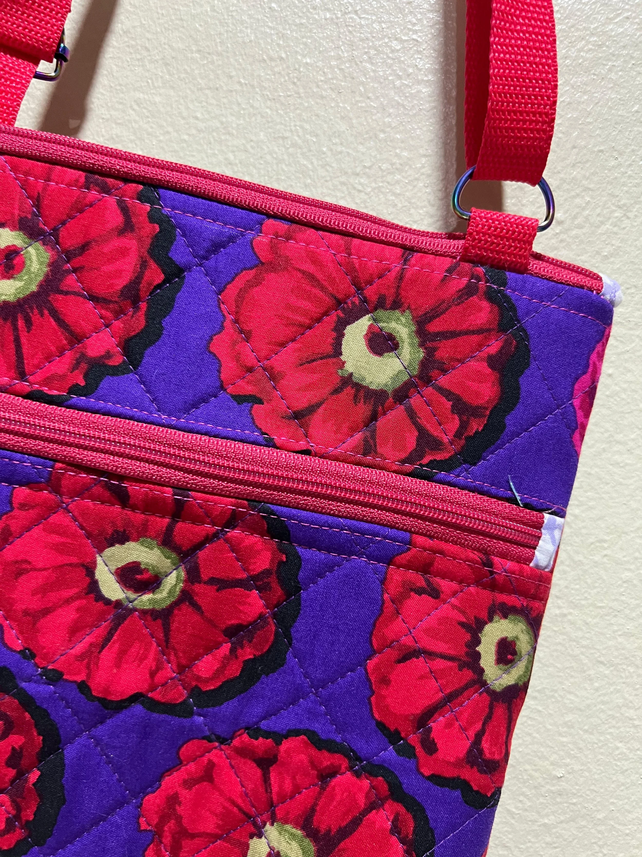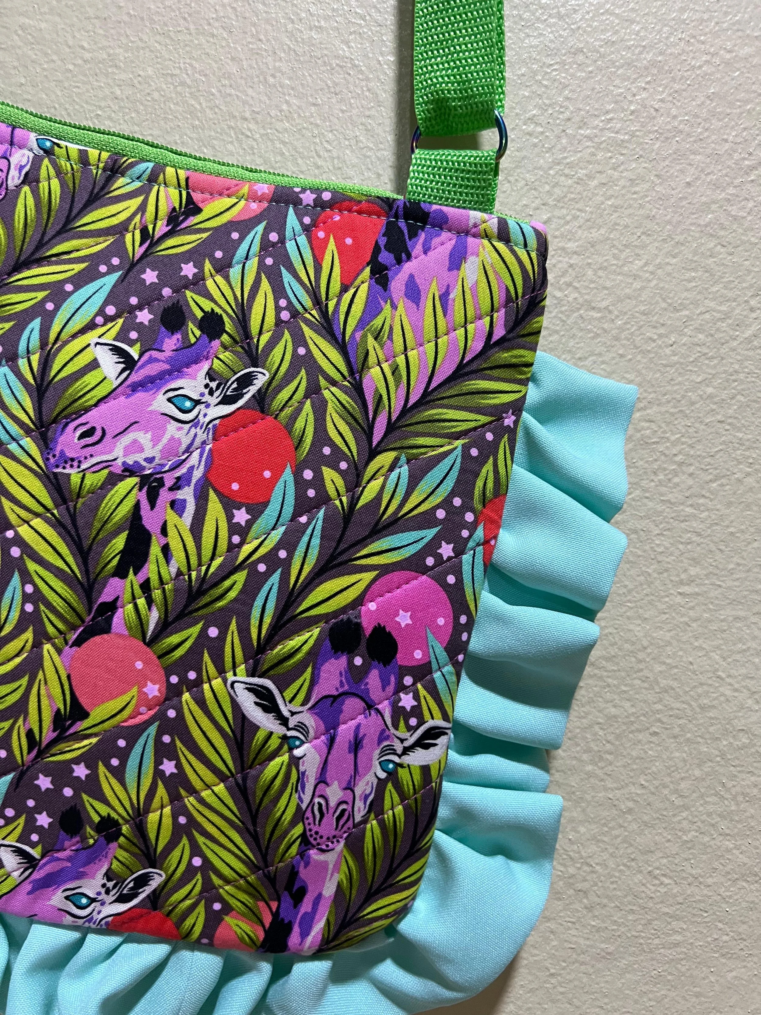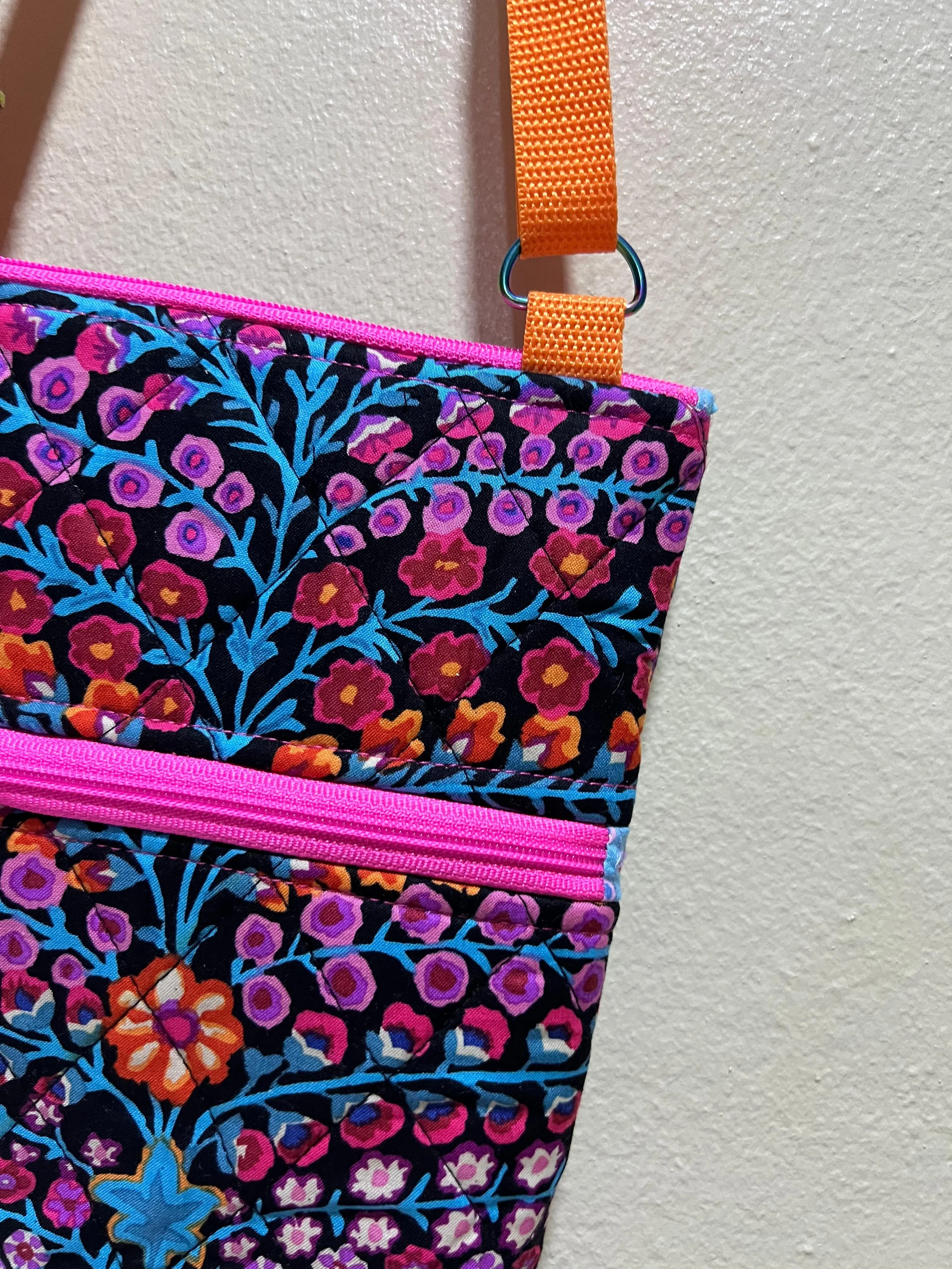 Bolso de colores vibrantes con estampado floral en la playa, cerca del mar y rodeado de vegetación verde.