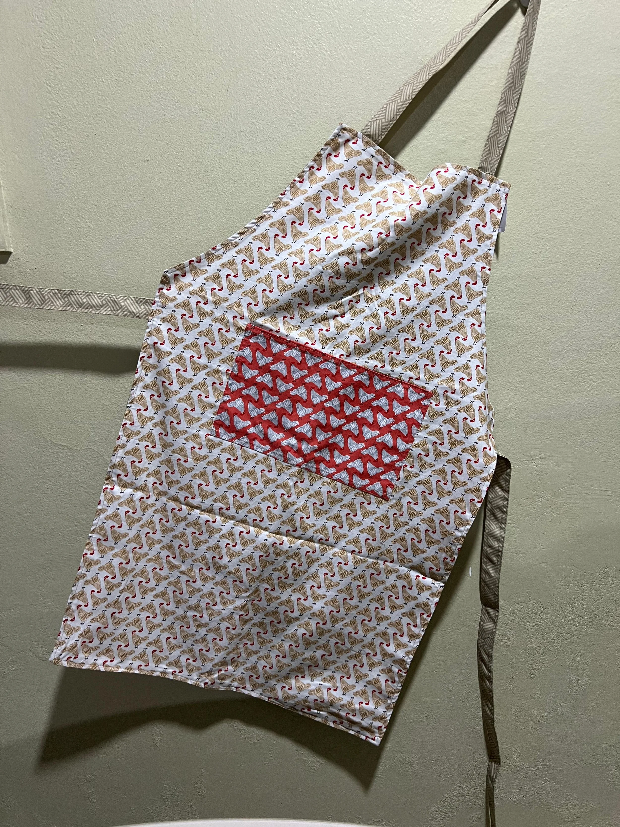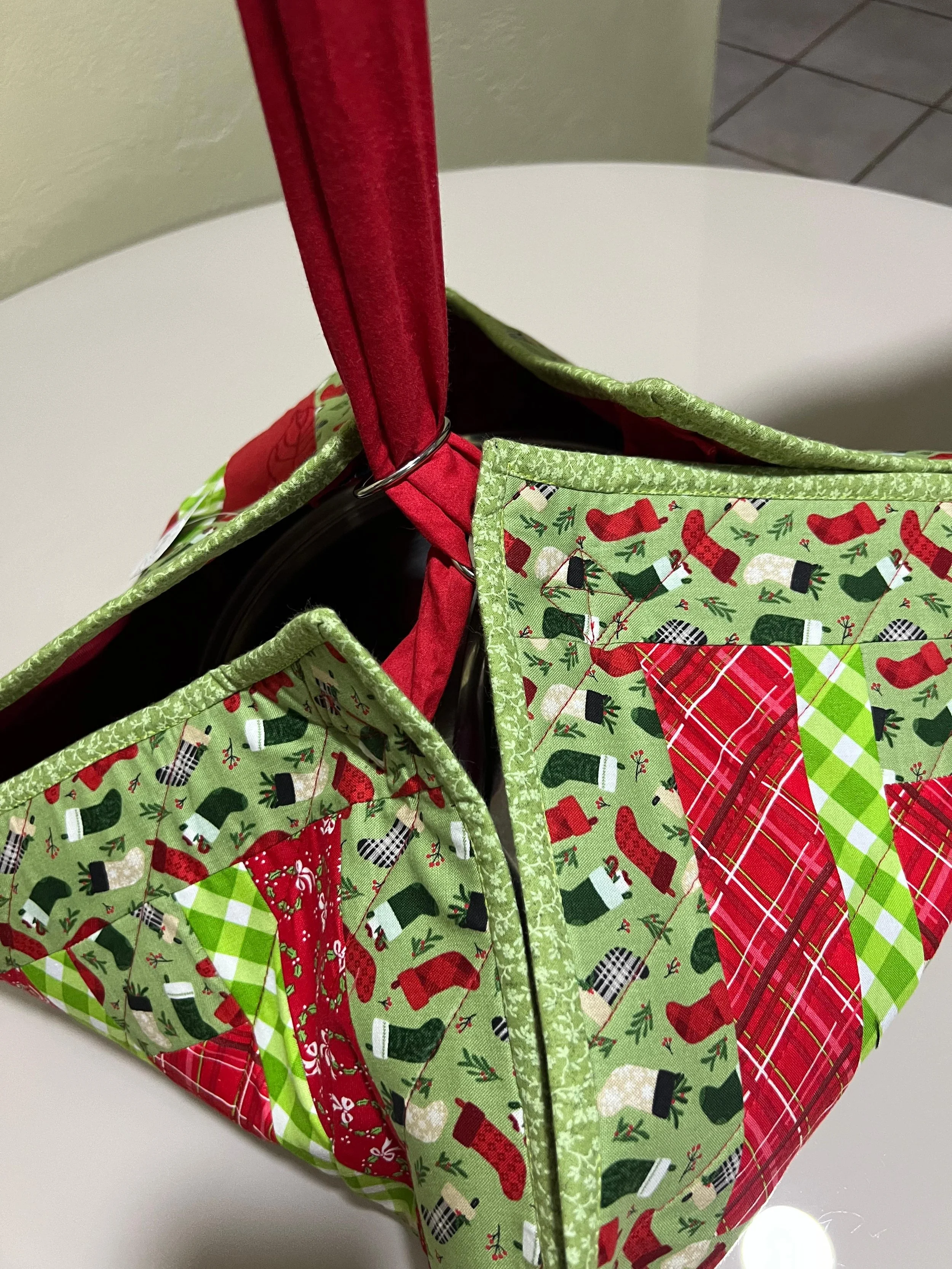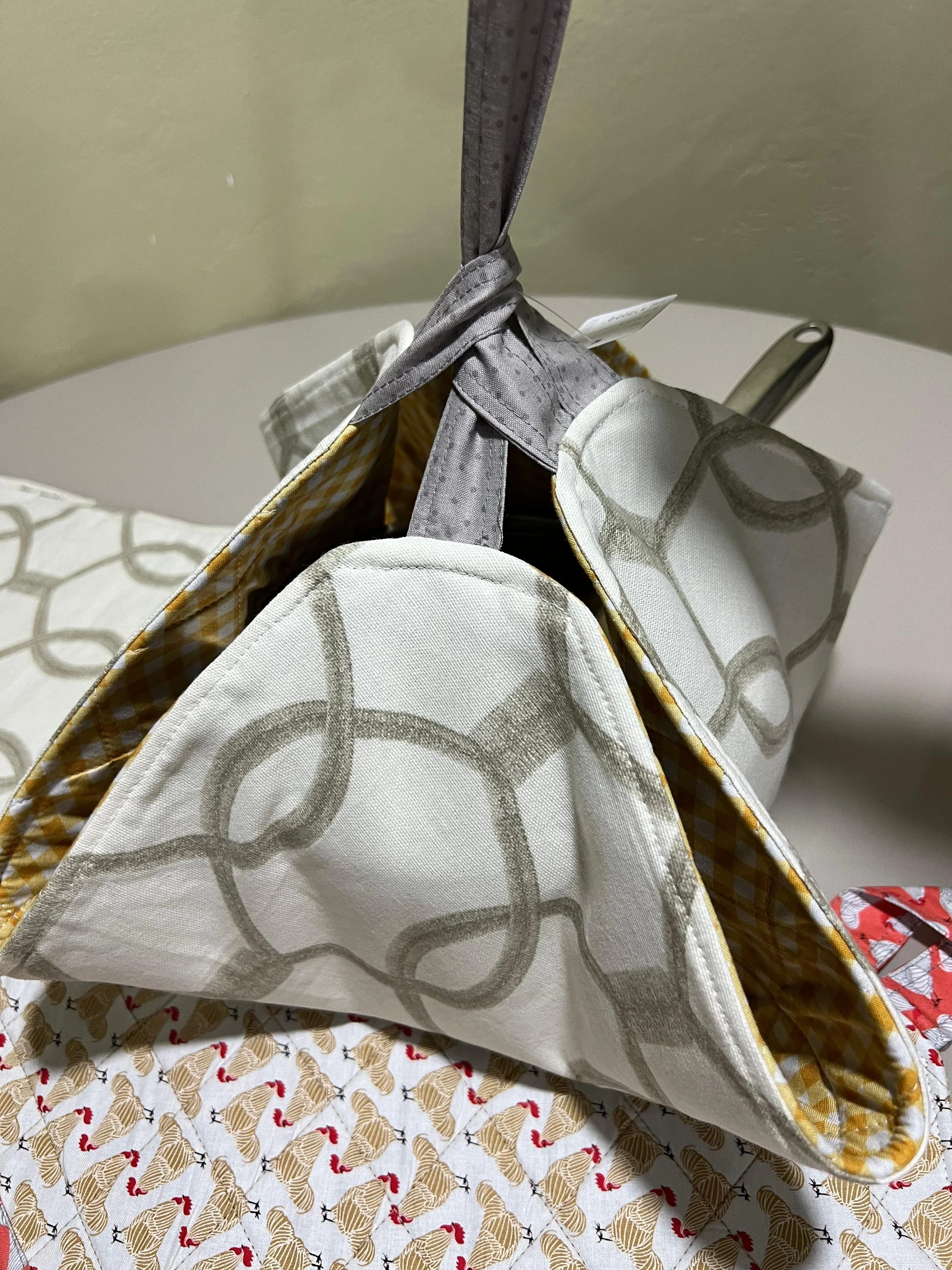 Camino de mesa de tela acolchada sobre una mesa de vidrio, con diseños de zanahorias y otros elementos. Planta decorativa al fondo y sillas alrededor de la mesa.