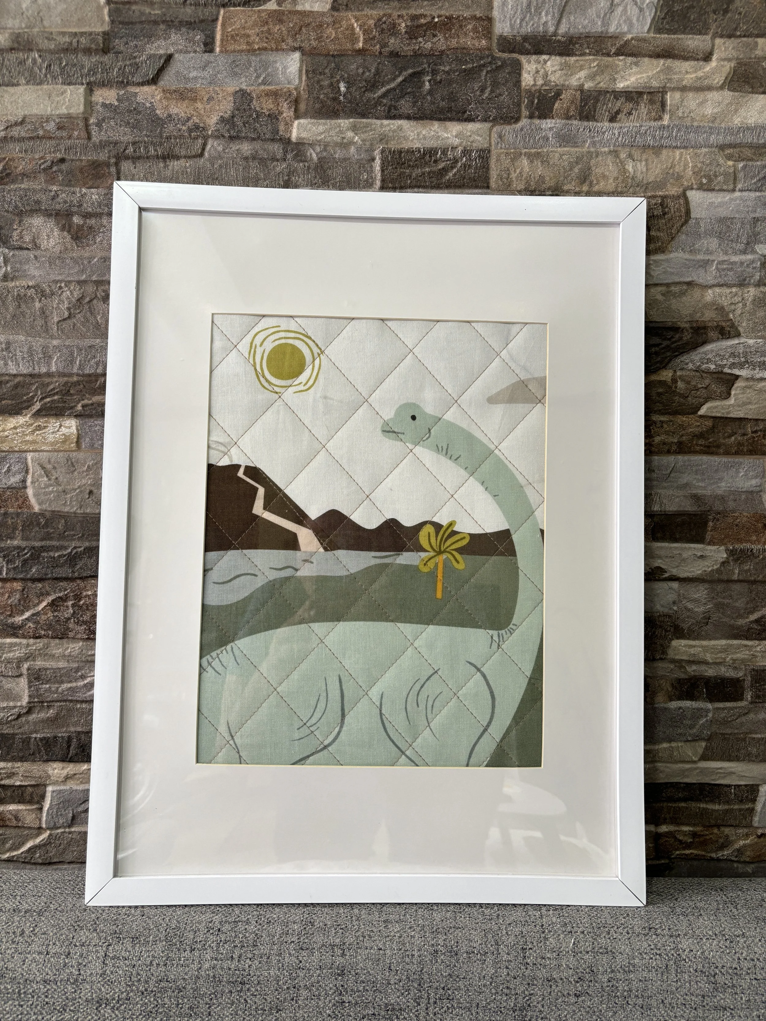 Colcha infantil con diseño de sirena colgada en un muro de ladrillos, con hojas de planta verde al frente.
