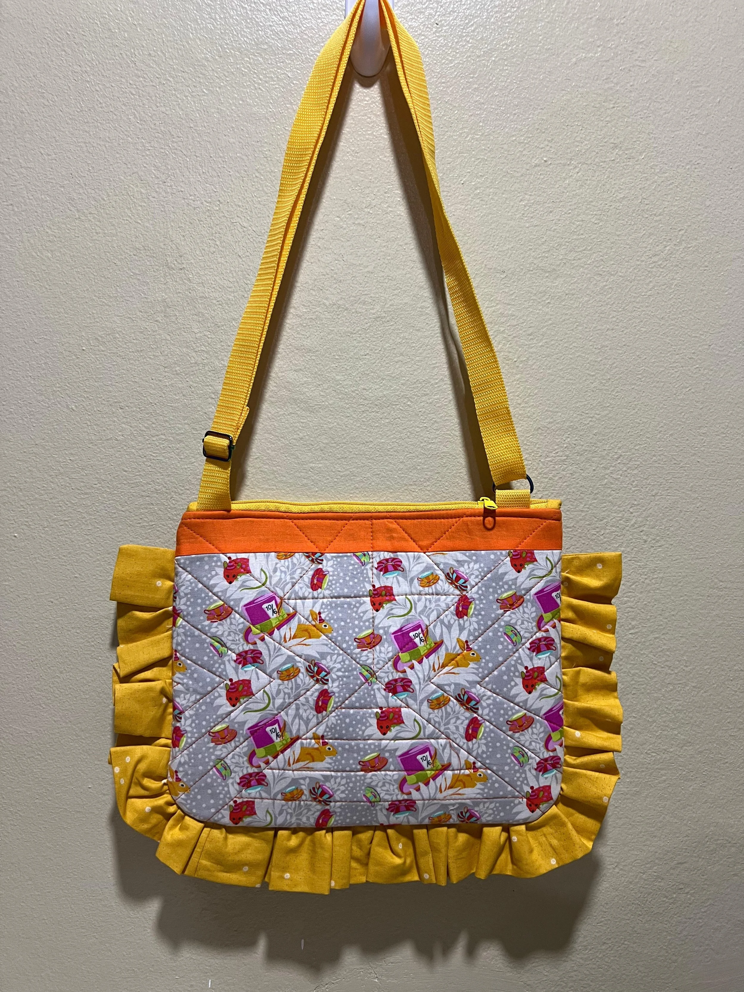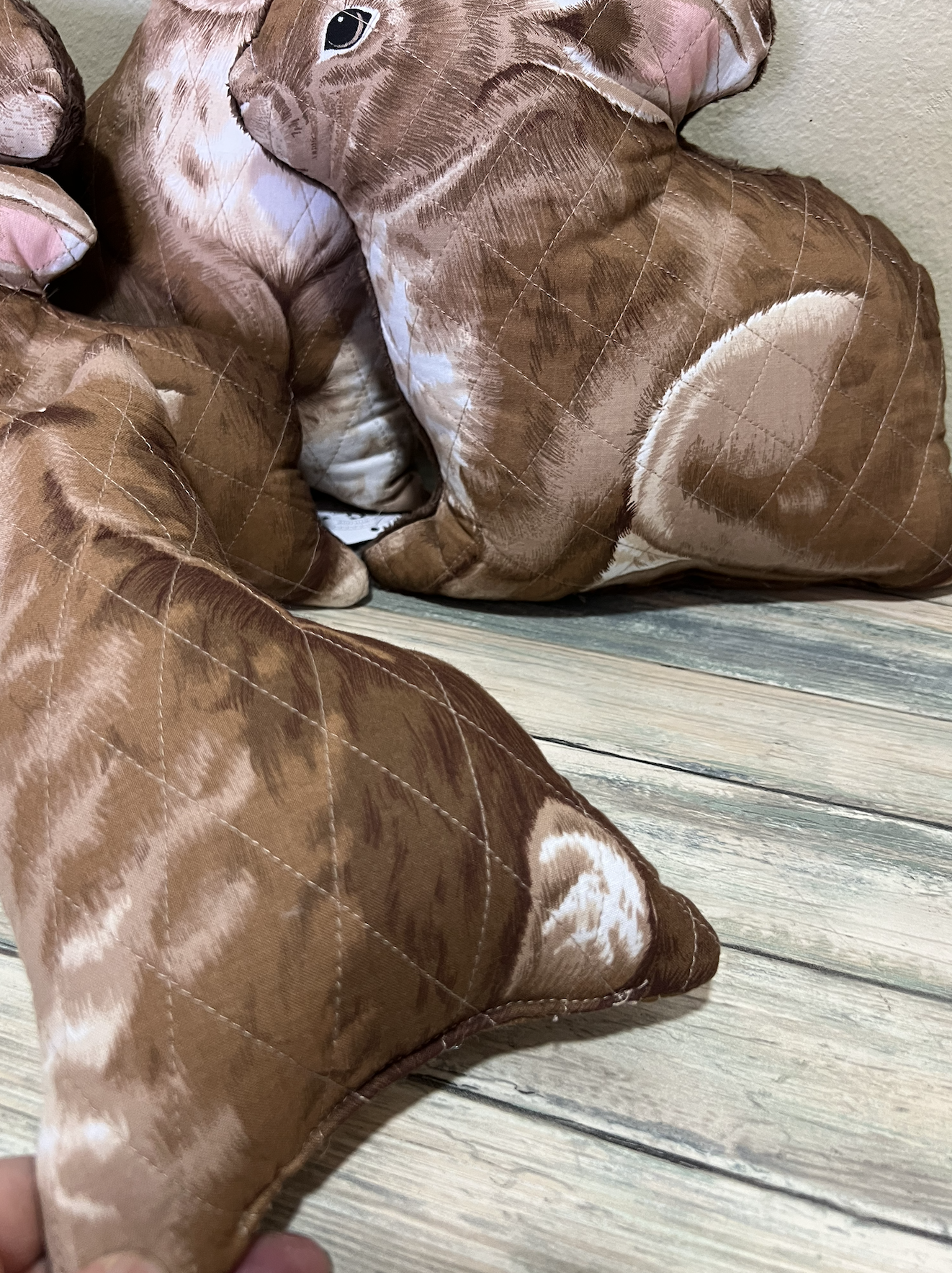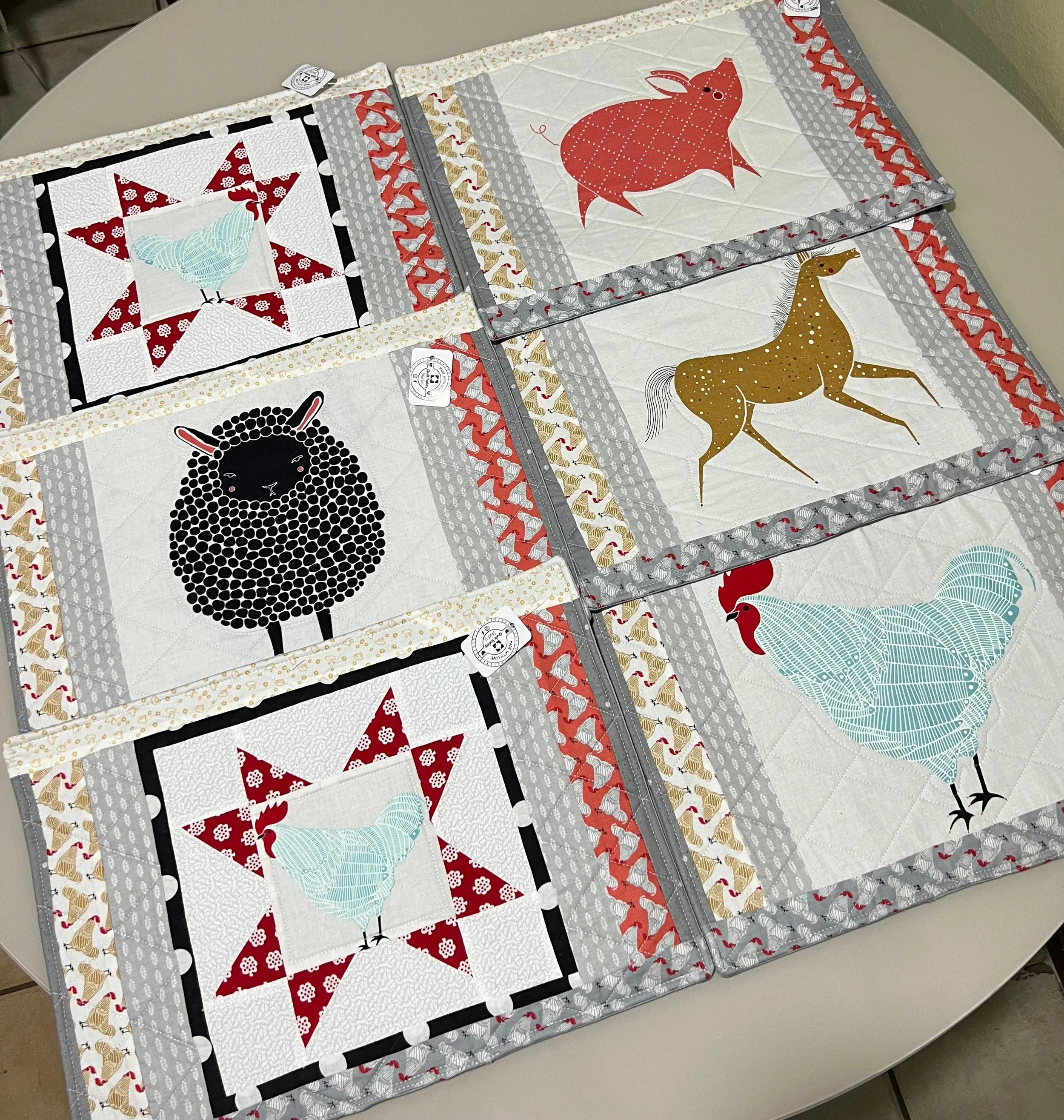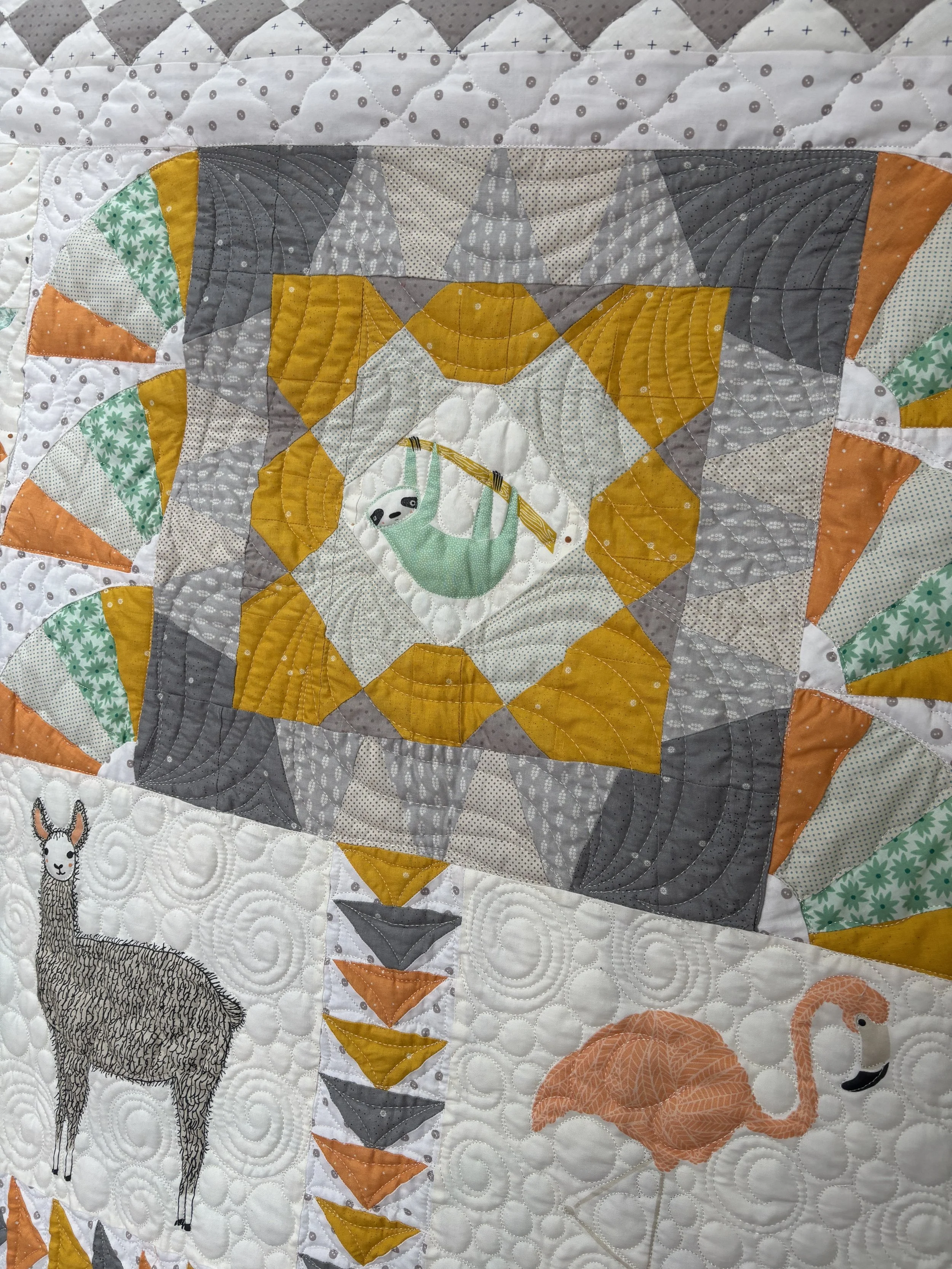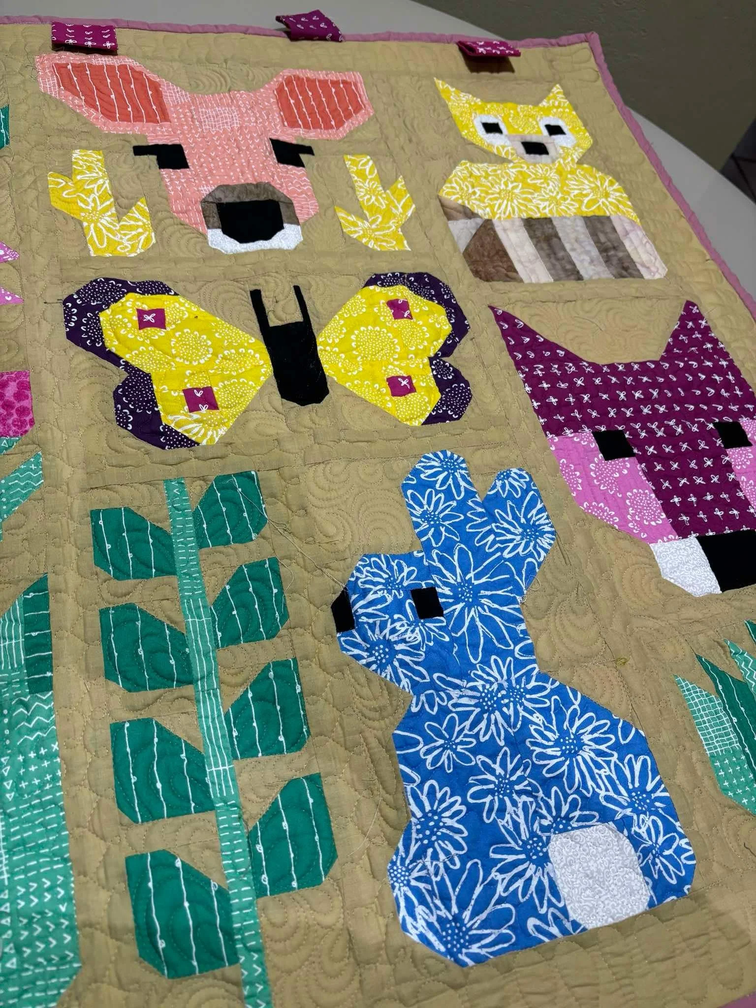 Colcha de patchwork con figuras de animales y plantas, incluyendo un conejo azul, un zorro amarillo, y una mariposa multicolor sobre fondo beige.