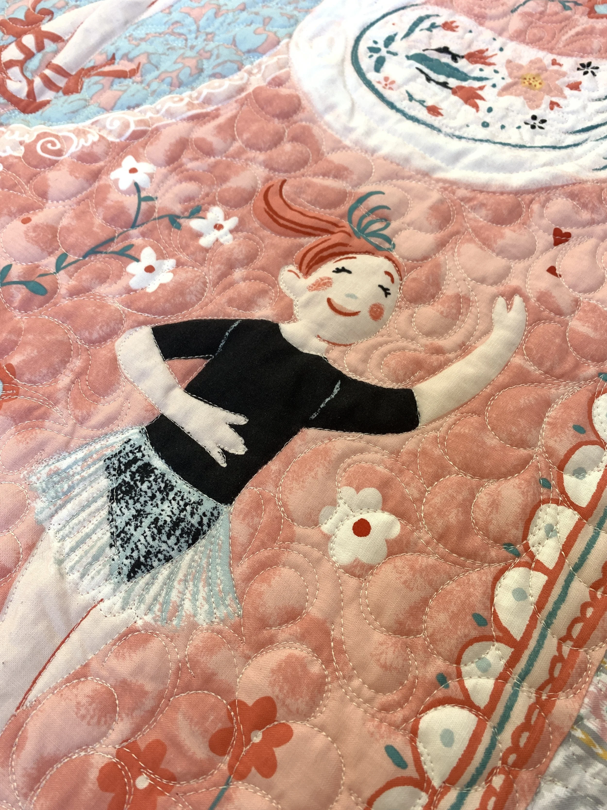 Diseño de colcha con dibujo de una persona bailando, rodeada de flores blancas sobre fondo rosa acolchado.