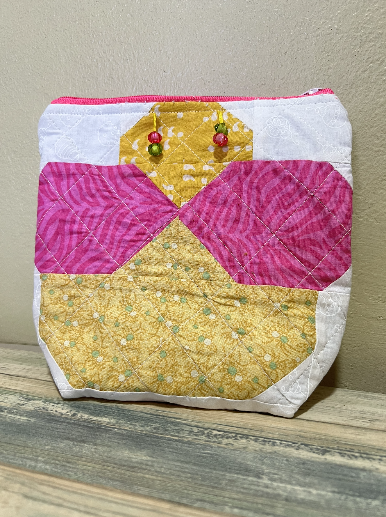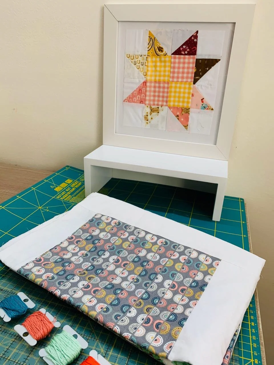 Almohadón de tela de retazos en varios colores sobre una mesa blanca.