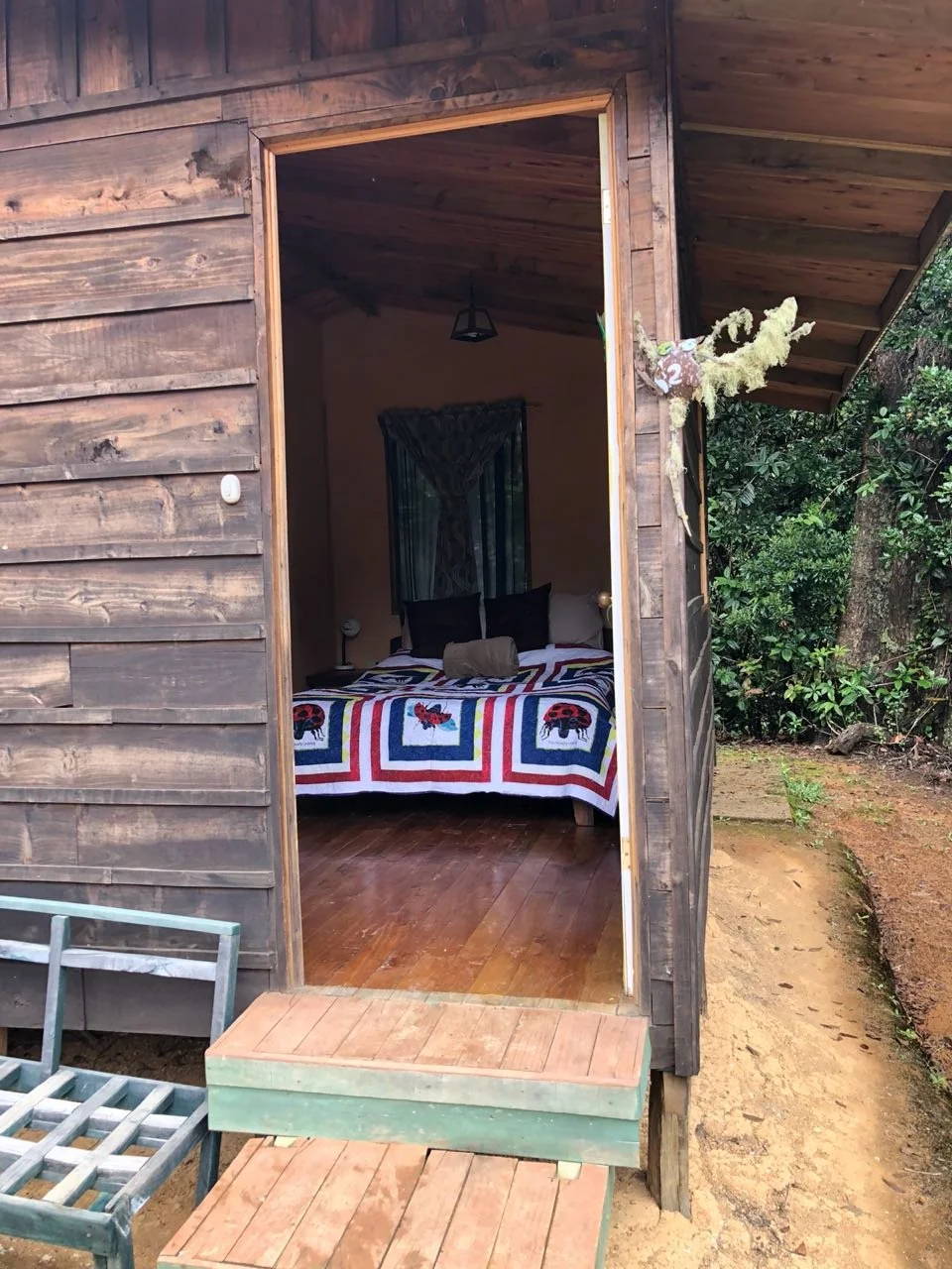Entrada de una cabaña de madera con una cama interior, cubierta con una colcha colorida con diseños de animales.