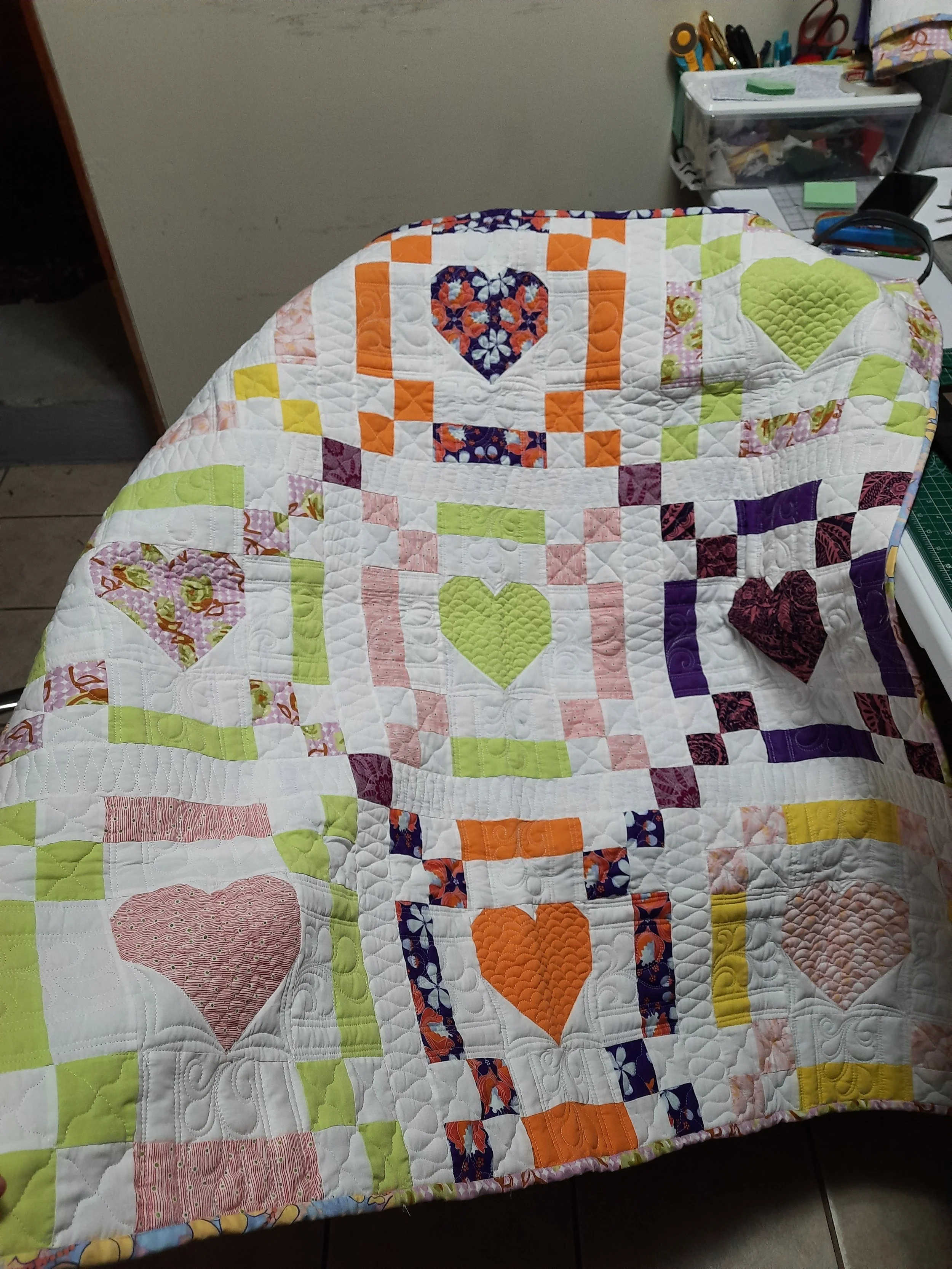Colcha de retazos con corazones y patrones coloridos.