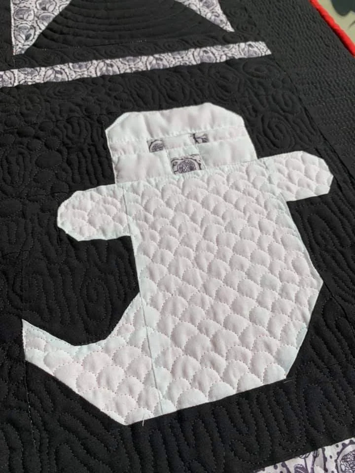 Figura de fantasma blanco en una colcha negra con diseño acolchado.