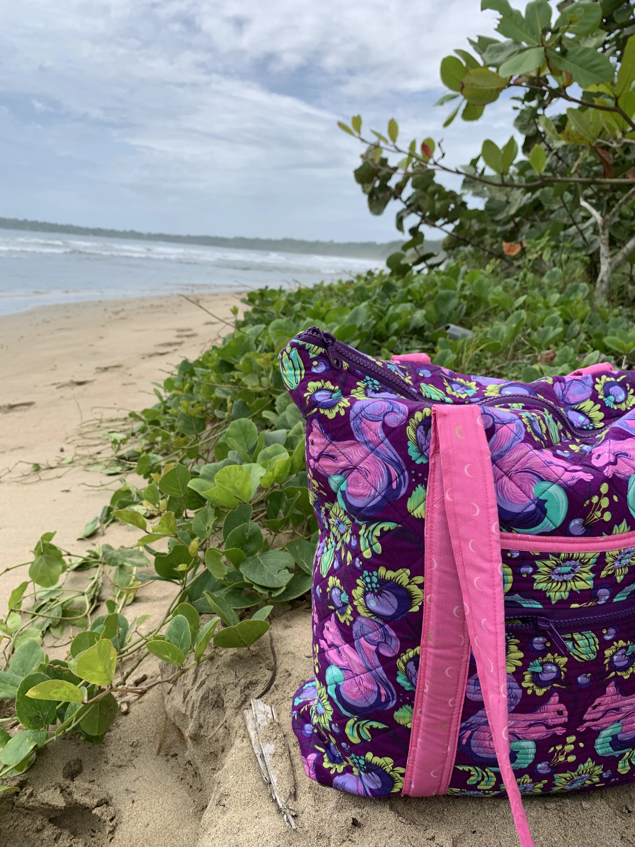 Bolso colorido con estampado floral en la playa, rodeado de vegetación y arena. El mar y el cielo nublado están de fondo.