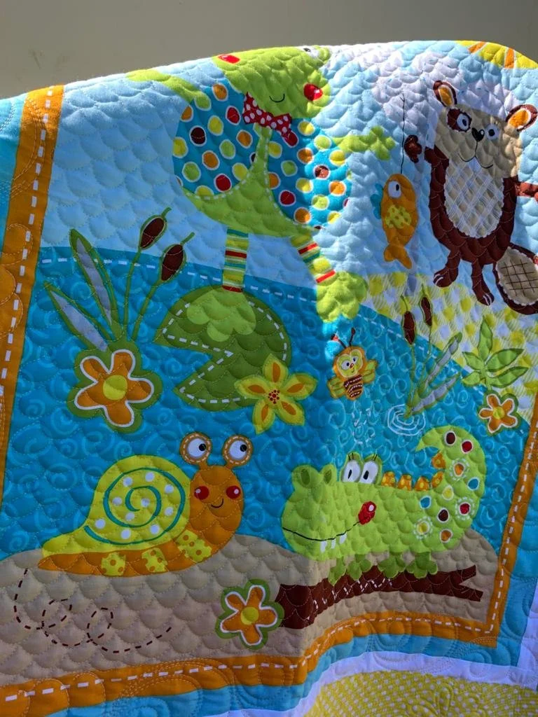 Colcha colorida con dibujos de animales como rana, castor, caracol y cocodrilo rodeados de flores y naturaleza.
