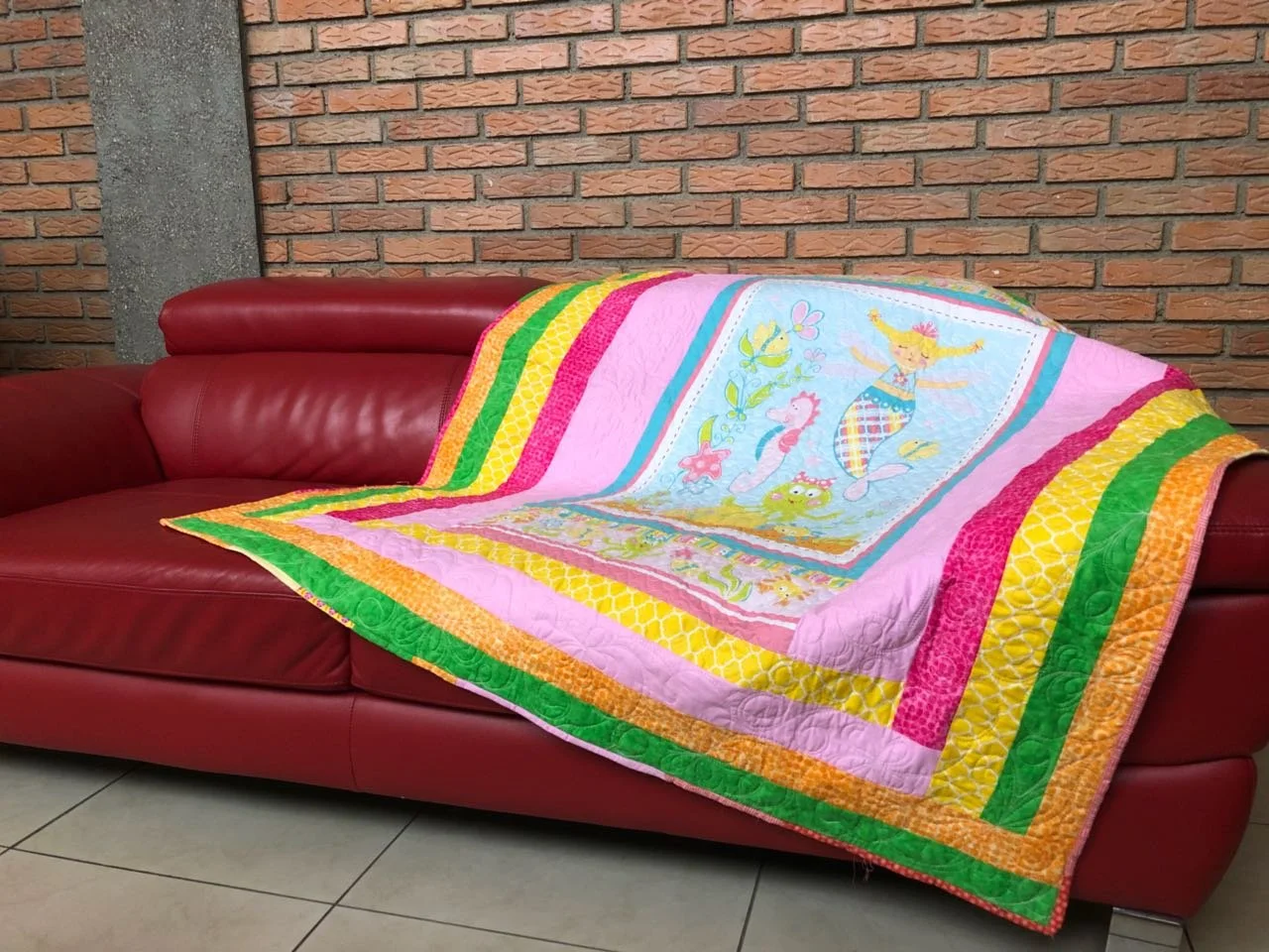 Sofá rojo con una colcha de colores brillantes encima, mostrando un diseño de sirena, caballito de mar y criaturas marinas, sobre un fondo de pared de ladrillos.